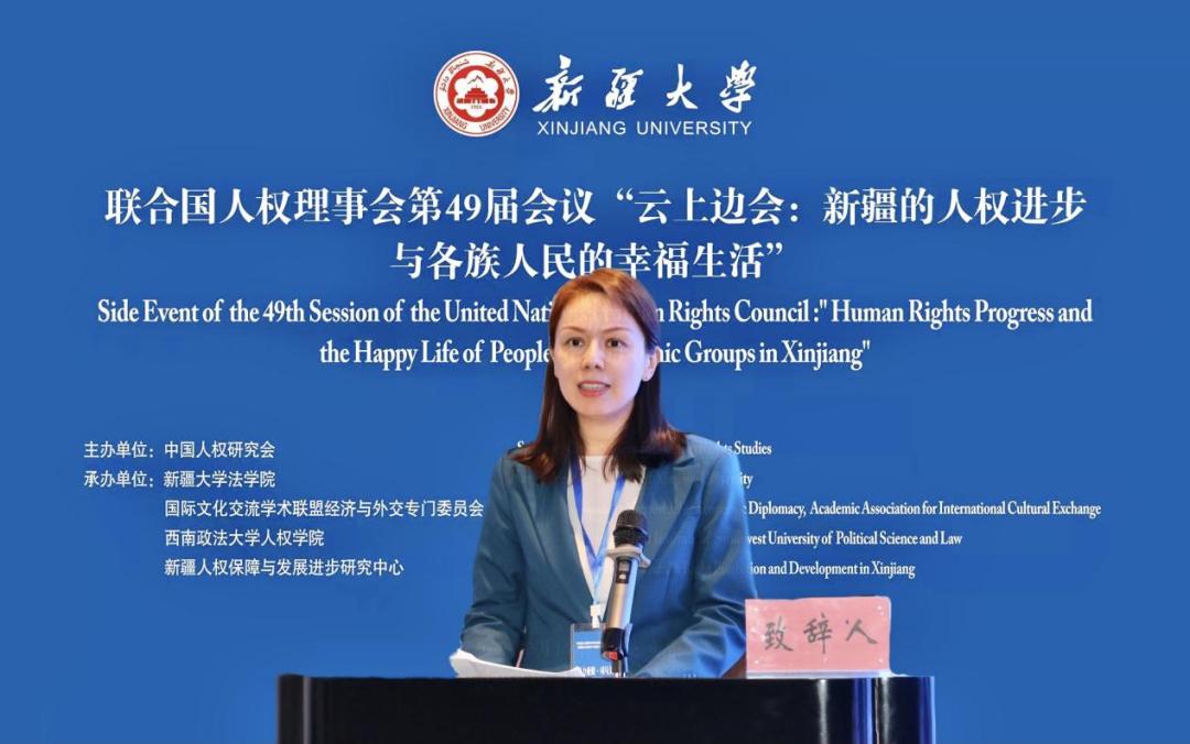 3月16日,由中国人权研究会主办,新疆大学法学院、新疆人权保障与发展进步研究中心等单位联合承办的联合国人权理事会第49届会议“云上边会”在线举行。来自中国、俄罗斯、巴基斯坦、古巴、韩国等国的40余位专家参会。与会专家学者用数据、个案资料等向世界展示了新疆的现代化发展和人权保障成就。专家指出,新疆各族人民的劳动权利依法获得了充分保障,经济社会稳定发展,人权事业取得了举世瞩目的成就。此次边会受到了社会的广泛关注。新华社、人民日报、中国日报、中国新闻等多家中央新闻媒体进行了宣传报道。