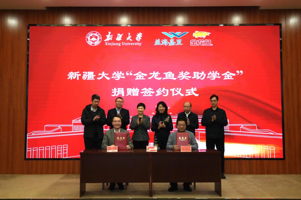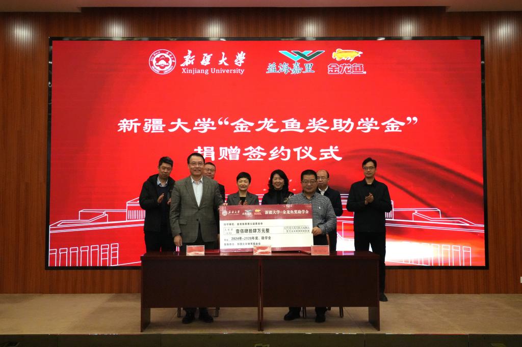 会上,新疆大学教育基金会理事长、资产经营管理有限公司党委书记、董事长,出版社有限责任公司总经理、副总编辑(兼)孙景兵与金龙鱼基金会理事长张建新共同签署新疆大学“金龙鱼奖助学金”捐赠协议,自2024年至2026年共为我校捐赠144万元,设立“金龙鱼奖助学金”。
