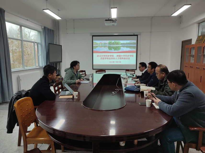 根据新疆大学与武汉大学签订的《武汉大学组团式包建新疆大学历史学院年度工作备忘录》,11月27日、28日,武汉大学历史学院援疆小组团成员王萌教授、李洋副教授、宋海超副教授莅临新疆大学历史学院,双方展开了本科生培养座谈、研究生教育相关问题座谈、考古学人才培养与学科建设座谈、国家社科基金与教育部项目申报座谈;王萌教授与李洋副教授分别为历史学院师生作了两场高质量的学术报告;三位武大老师参与了我校历史学院新进教师王晶博士的新课试讲,并提出宝贵意见。两天密集的行程安排,充分凸显了两校历史学院之间全面深度的合作、有组织的科研与共同追寻高标识性研究的决心。