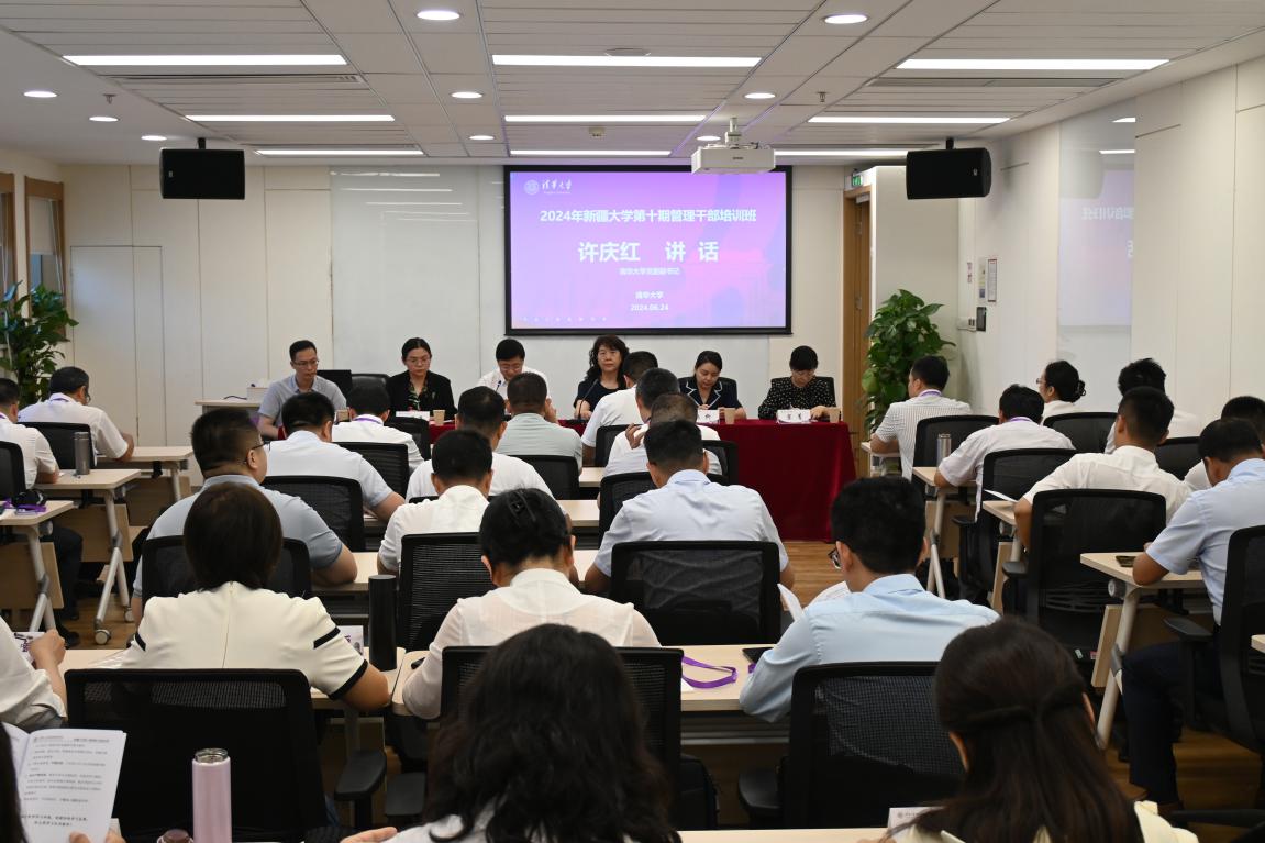 许庆红代表清华大学对第十期管理干部培训班开班表示祝贺,对学员们的到来表示欢迎。他指出,建设高水平大学,不仅需要高质量的教师队伍,更需要一支政治过硬、管理能力优良的高素质干部队伍。他强调,近年来,清华大学不断创新培训方式,精心选拔师资,强化服务管理,为新疆大学培养了大批管理干部,起到了良好的效果。他希望通过本次培训,帮助参训学员进一步提高站位、开阔视野、提升素质、增强能力,努力为学校的建设和发展作出新的更大贡献。他强调,习近平总书记高度重视清华大学和新疆大学,对两校多次给予批示并亲临视察,为两校的建设发展指明了前进的方向。他希望,两校干部教师要牢记总书记的殷殷嘱托,勇担历史使命,以此次培训为契机,针对对口支援等方面具体问题深入加强交流与沟通,持续推进理念更新、模式创新、平台升级,推动对口支援工作再上新台阶,为促进两校高质量的发展奠定更加坚实的基础,共同开拓中国特色世界一流大学高质量发展新局面。