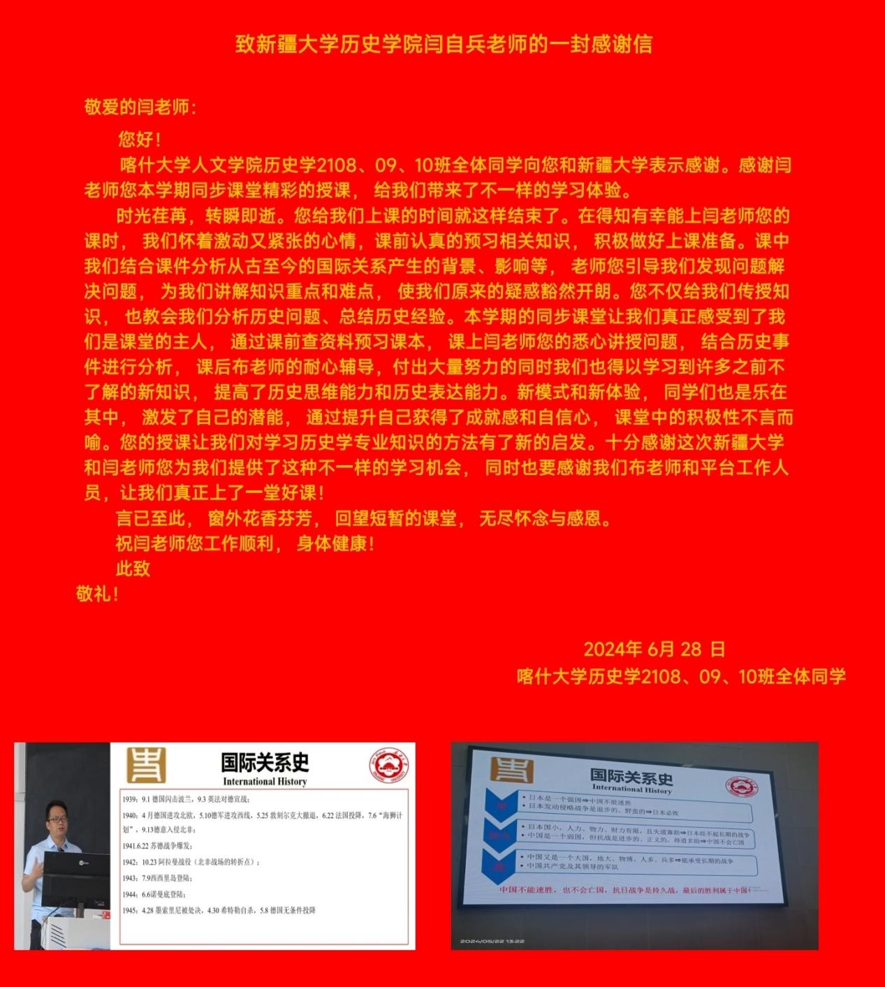6月28日,为了表达对新疆大学和授课教师的感谢,喀什大学人文学院历史学2108、09、10班全体同学向闫自兵老师发来诚挚的感谢信。喀什大学人文学院也发来了感谢函,提出“同步课堂使得我院任课教师和学生受益匪浅。课程不仅得到了教师和学生的好评,还调动了教师教学改革的主动性、积极性,进一步关注信息化时代背景下的学生需求。课程应用信息技术创新教学方式,通过‘慕课西行’远程智慧教学,使教学信息更加充分、教学内容更有效。”
