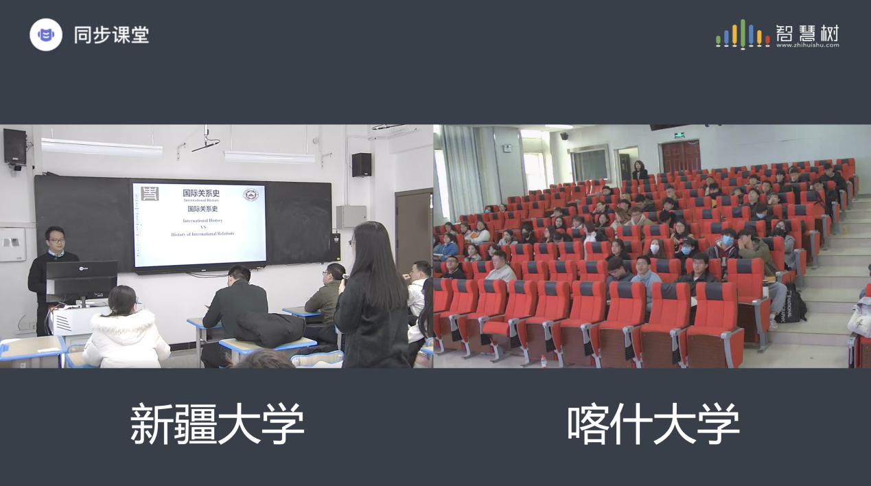 2023—2024学年第二学期,新疆大学与喀什大学依托智慧树平台,跨越千里成功实现《国际关系史》课程同步课堂。这是新疆大学首门全程输出型同步课堂。课程由新疆大学历史学院闫自兵副教授主讲,新疆大学历史学院学生在智慧教室上课,喀什大学人文学院历史学2108、09、10班学生通过智慧树平台同步上课。
