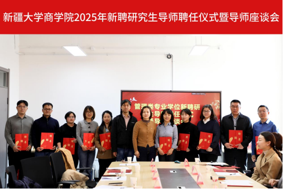 为深化研究生教育改革,构建产教融合双轮驱动培养体系,3月14日下午,新疆大学商学院在友好校区举行2025年新聘研究生导师聘任仪式暨导师座谈会。49位来自中南财经政法大学、上海大学等高校的学者,校内优秀中青年教师,以及财政部新疆监管局、新疆交通运输厅、新疆生产建设兵团企业联合会等自治区和兵团重点企事业单位的专家受聘为管理类专业学位研究生导师。财政部新疆监管局党组成员、二级巡视员罗晓培,新疆交通运输厅正高级会计师梁淑珍、经济与管理学院副院长李清等出席活动。
