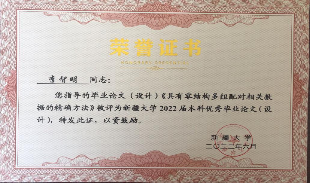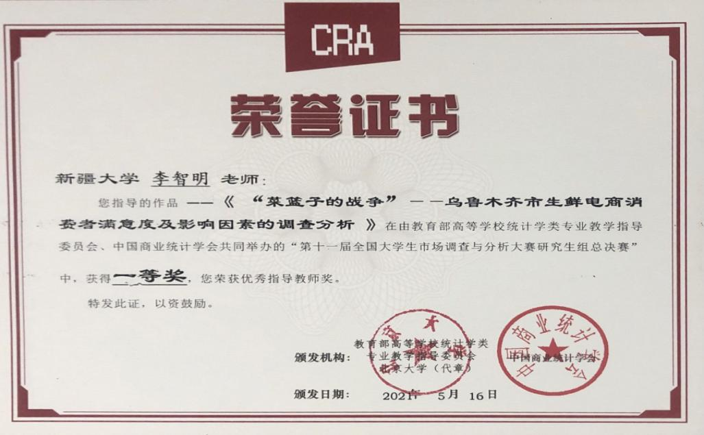 李智明老师自担任统计系主任以来,加强统计系学科梯队建设,以学术研究和创新活动提高师资队伍素质,挑选科研水平高、教学能力强的教师主讲本科生和研究生主干课程,负责课程资源建设。2020年组织统计系教师积极申报国家一流专业建设点,并获批统计学专业国家级一流本科专业建设点。《数理统计》课程先后校级一流本科课程、自治级一流本科课程,打造《数理统计》国家金课。